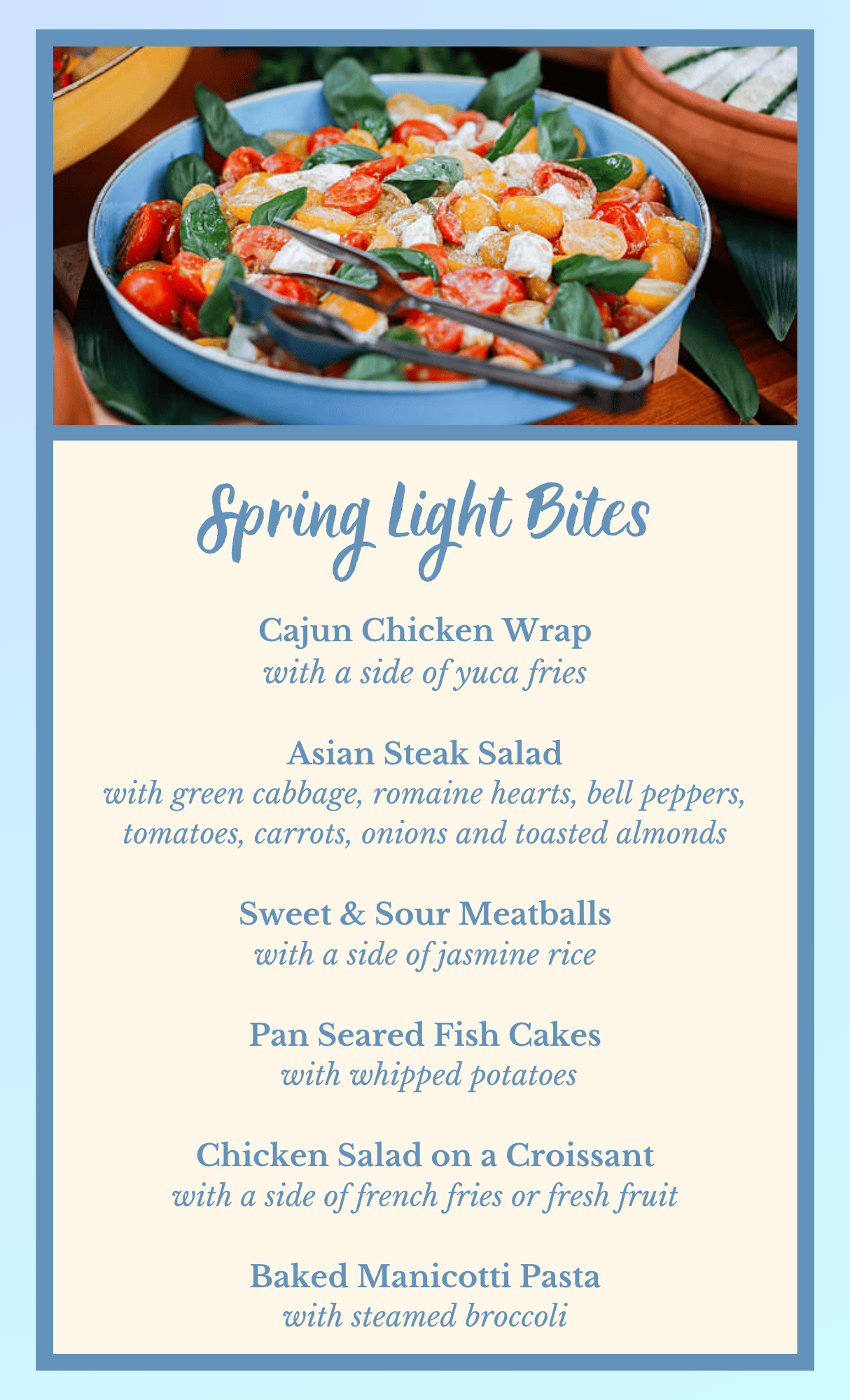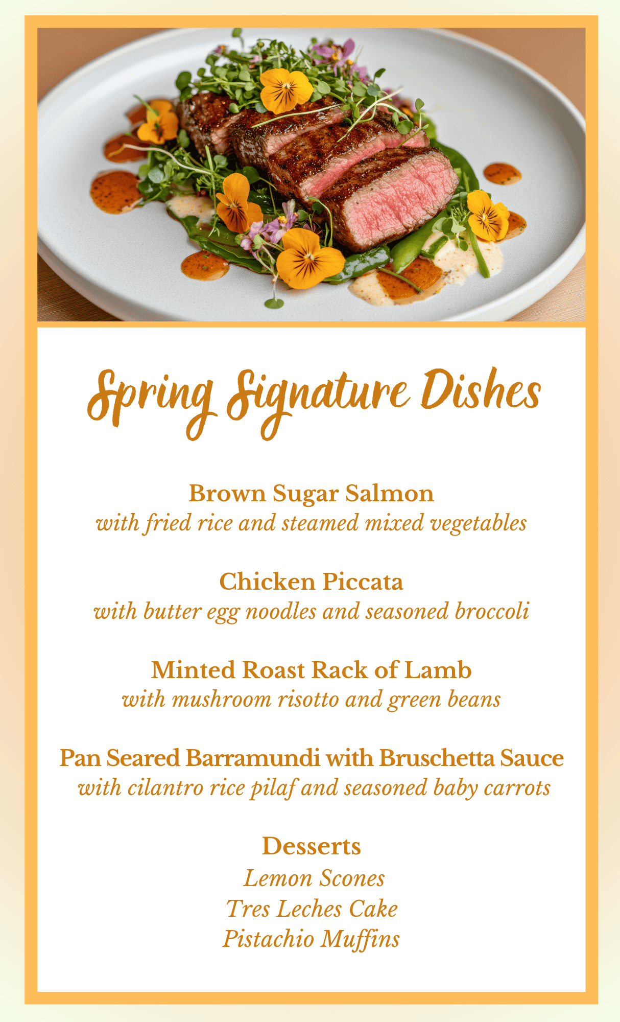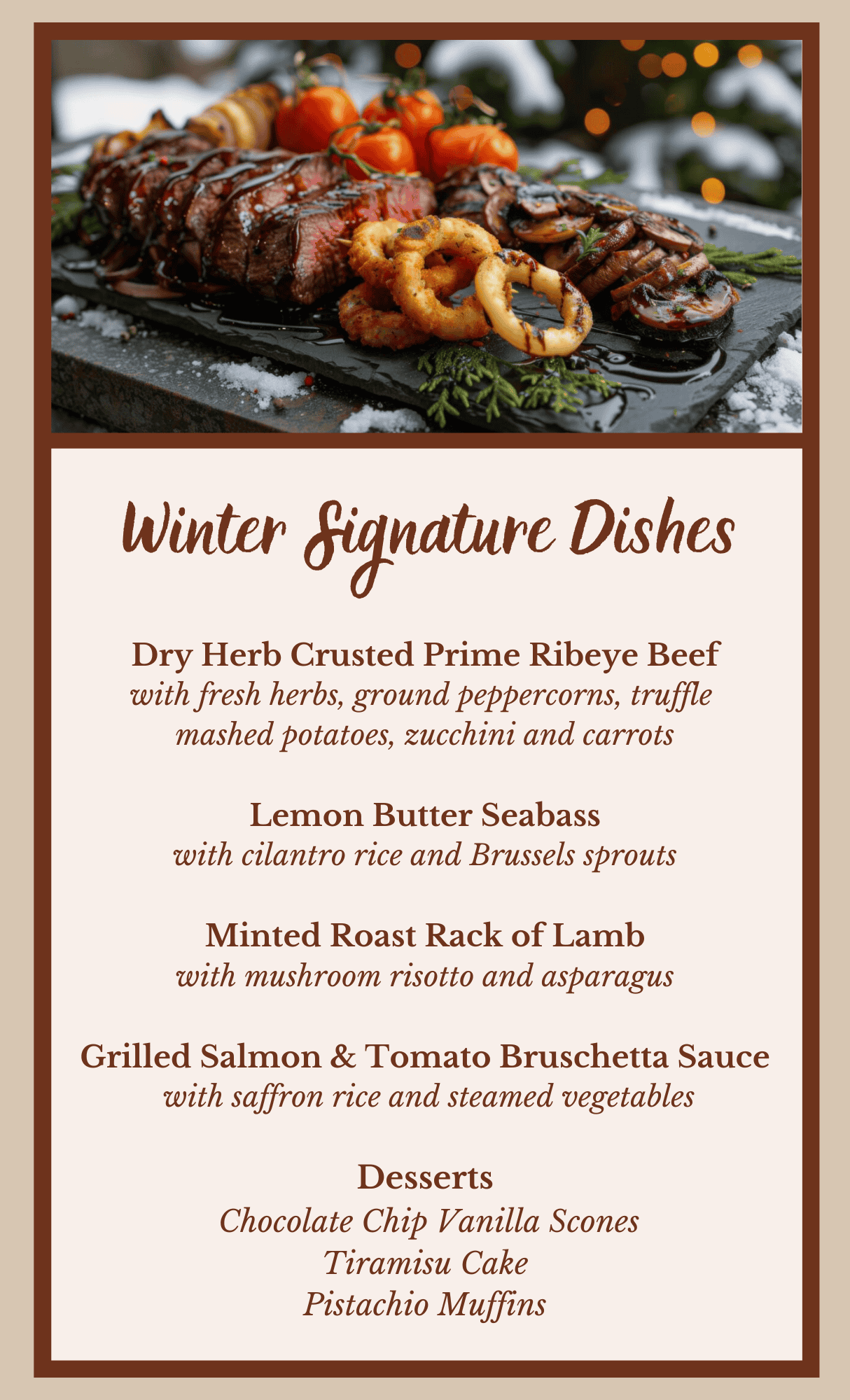 - Menu selections such as prime rib, grilled salmon, fresh vegetables, and much more
