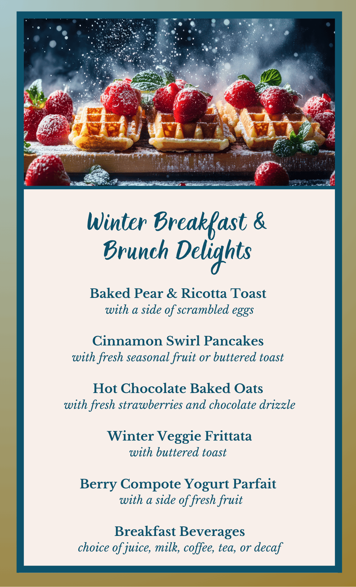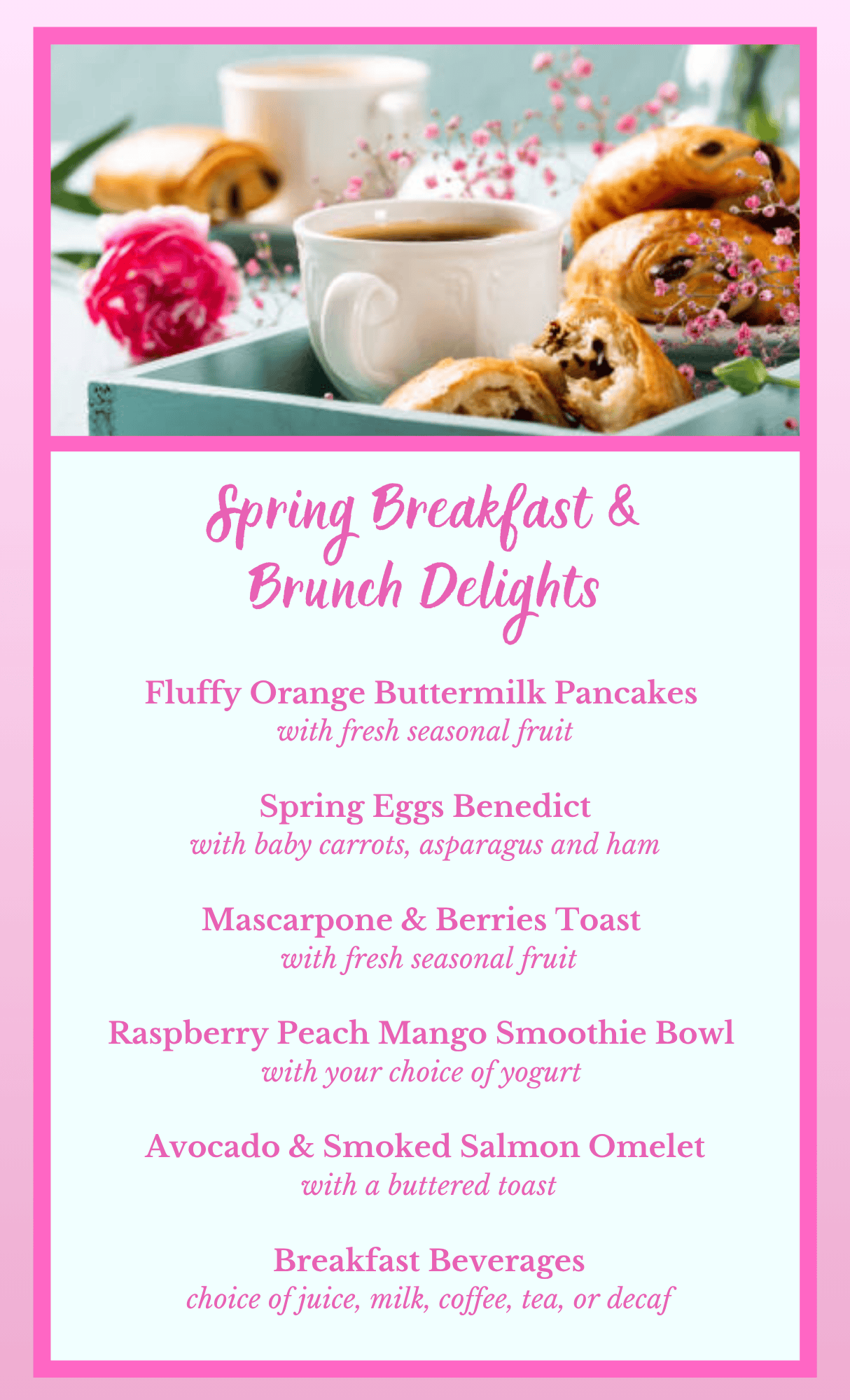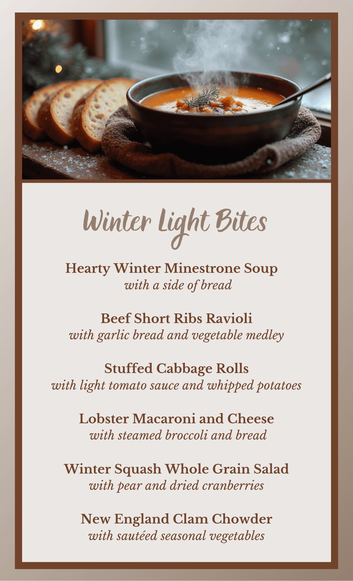 - Menu selections such as prime rib, grilled salmon, fresh vegetables, and much more